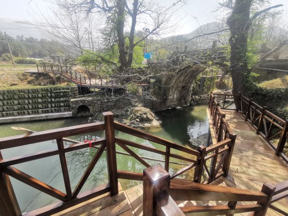 項(xiàng)目建成后由于景區(qū)升級(jí),從滑道800米處改道入河,增加一段河道漂流至接待中心水域,增建一個(gè)下碼頭。河道漂流長度約500m。