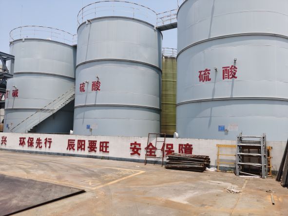 辰陽化工20190828日取得衢州市應急管理局核發的危險化學品經營許可證(有效期至20220827,證書編號:衢應急經(龍)字2019000010,許可經營范圍:帶儲存經營鹽酸(液體儲量3000噸)、硫酸(液體儲量1550噸)、液堿(液體儲量900噸),共計3種;無倉儲經營氫氧化鈉、氨溶液[含氨>10%]、次氯酸鈉溶液[含有效氯>5%]12-二甲苯、1,3-二甲苯、14-二甲苯、二甲苯異構混合液、氟化氫[無水]、氫氟酸、環己酮、環己烷、三氯甲烷、四氯乙烯、1,122-四氯乙烷、11-二氯乙烯1,2-二氯乙烯、三氯乙醛[穩定的]、環氧樹脂、乙酸乙酯、甲醇、乙醇[無水]、涂料用稀釋劑、甲醛溶液、甲酸、乙酸[含量>80%]、乙酸溶液[10%<含量≤80%]、磷酸、碳酸鋰、氫氧化鋰、氯化鈣;易制爆:過氧化氫溶液[含量>8%]、硝酸、六亞甲基四胺,共計33種(其中碳酸鋰、氯化鈣為非危險化學品)。經營儲存場所位于廠區北側,包括1座戊類罐區(1500m3液堿、2500m3硫酸罐和6500m3鹽酸罐)、1座裝卸車臺及輔助車間1F(包裝間)。